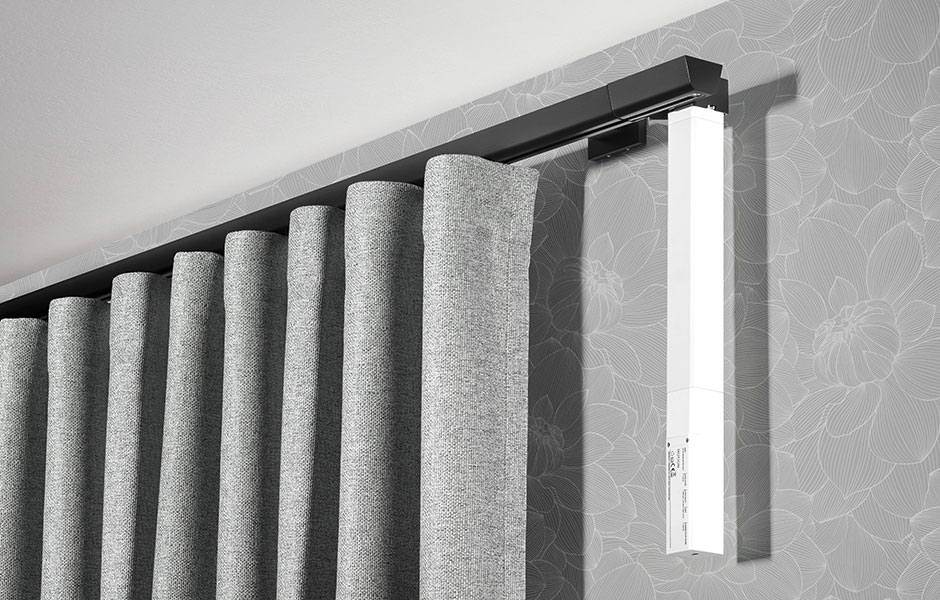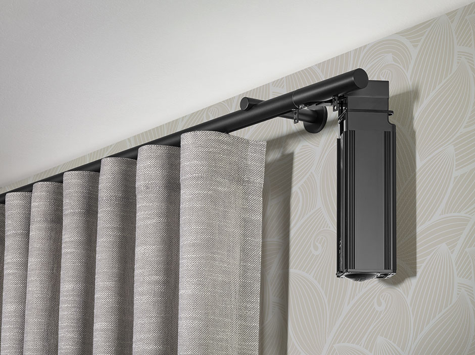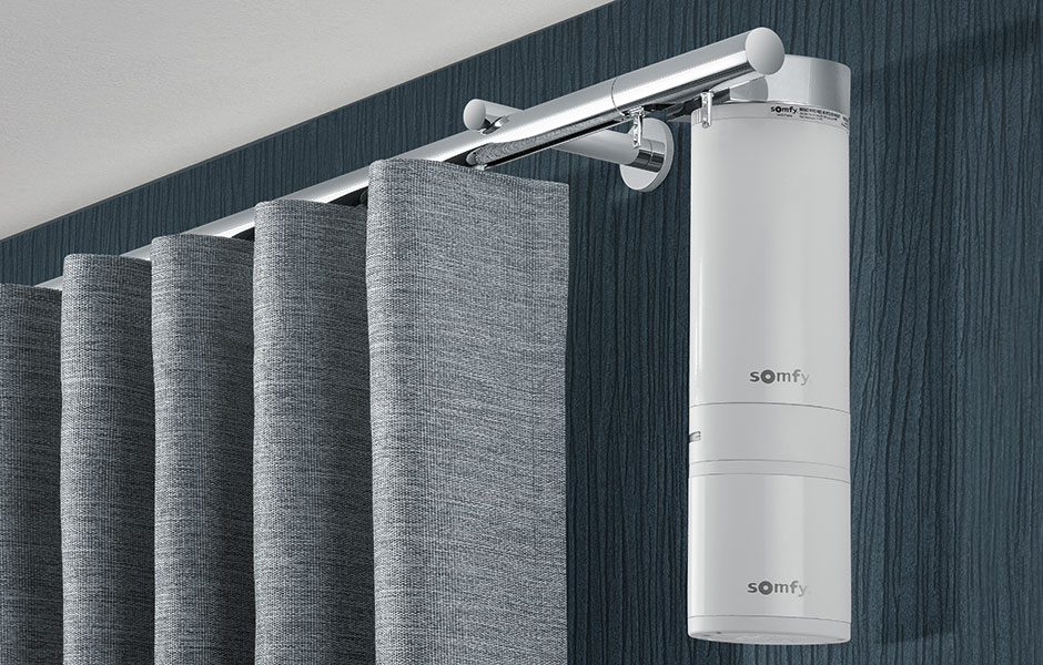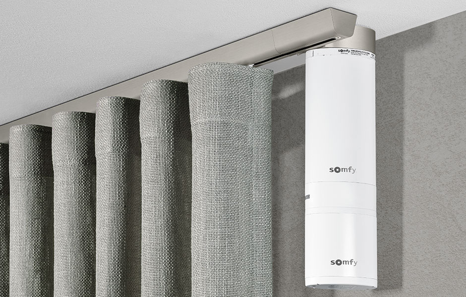 BÜSCHE®-Vorhanggarnituren mit Somfy-Motoren lassen sich per Fernbedienung steuern. Die Funktechnologie kann einfach in bestehende Somfy-Systeme integriert werden.