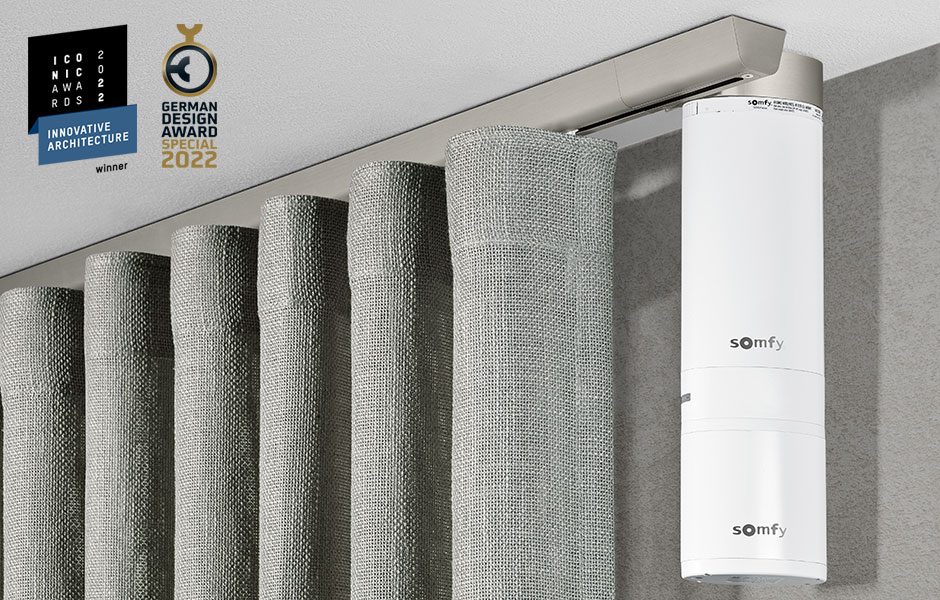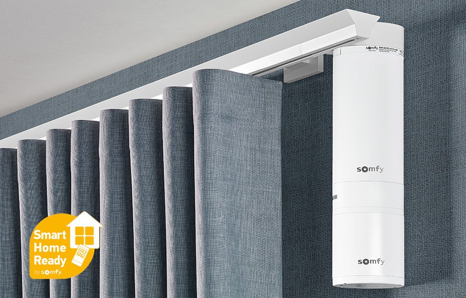 Mit Somfy-Funkprodukten ist die Grundlage für ein intelligentes Zuhause gelegt. Der motorisierte Vorhang kann bspw. zeitgesteuert und mit anderen Produkten, wie Rollläden oder Lichter, vernetzt werden. Über die Smart-Home-Zentrale TaHoma ist auch eine App-Steuerung möglich.