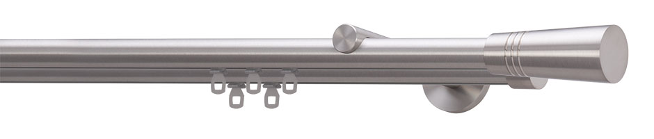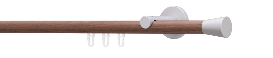 Eine große Auswahl an Oberflächen lässt die klassische Vorhangstange ganz unterschiedlich in Erscheinung treten. Mit Trägern und Endkappen in einer abgesetzten Farbe oder Oberfläche sind der Individualisierung beinah keine Grenzen gesetzt.