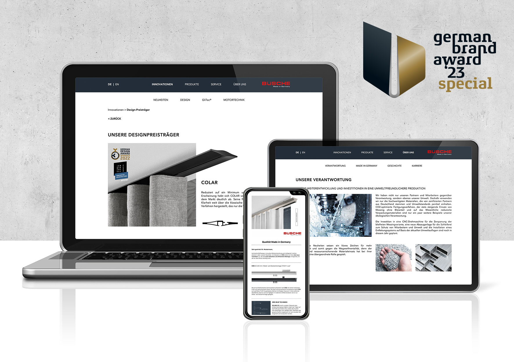 Con il nostro rilancio del marchio, abbiamo reso visibile ciò che BÜSCHE® rappresenta nel suo nucleo: innovazione, raffinatezza tecnica e artigianato appassionato. Con un’immagine uniforme, un design sostenibile e una rinnovata consapevolezza del nostro valore, siamo pronti per il futuro. Anche il German Design Award ha riconosciuto questi valori, onorandoci con ben due premi.